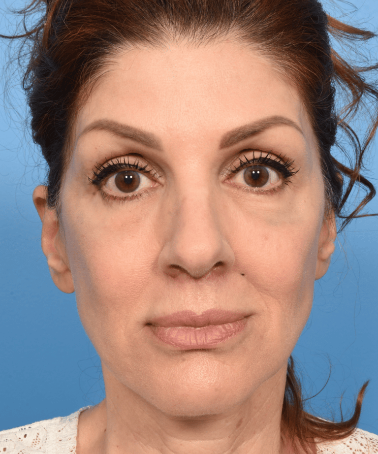 Patient information: 59-year-old female underwent a Deep plane rhytidectomy, Deep neck contouring, temporal browlift, four eyelid blepharoplasty, lip lift, laser resurfacing of perioral area