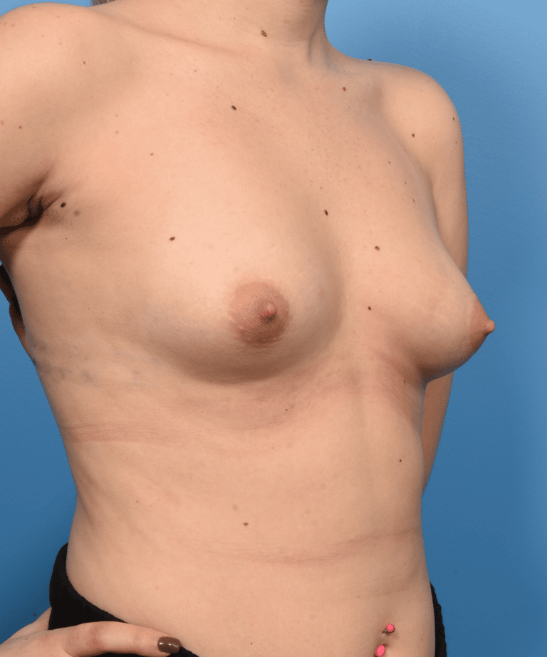 Patient information: 27-year-old patient underwent a bilateral augmentation using 275 cc silicone gel-filled implants. Implant placement is in the submuscular position via an inframammary incision. The breast crease has been lowered and paired with ample lower pole fullness. The nipple position has improved, and they now point upward.