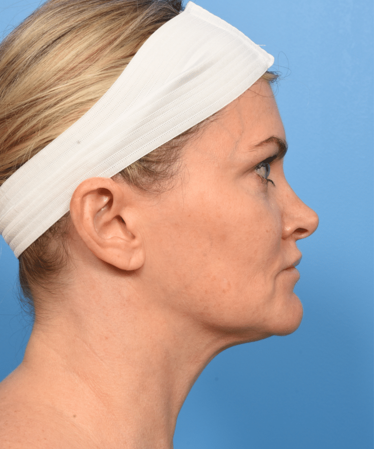 Patient Information: 49 year old female underwent MyEllevate procedure. This patient now has a sleek and tapered jaw and neck line. This is seen best in the side view.