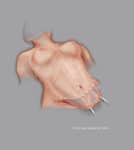 The excess skin is elevated above the abdominal wall and pulled downward. Remember the umbilicus remains as part of the abdominal skin flap. The area of resection (removal) is indicated with a dotted line. There is no hole in the abdominal skin flap because there was no incision made around the umbilicus.