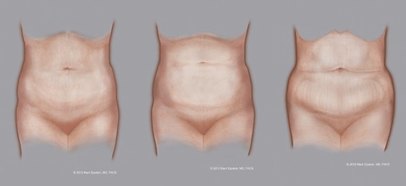 Figure 1 – The spectrum of balance between excess skin and fat – The patient represented by the left figure would probably be best contoured with liposuction, as her problem is mostly excess fat with little excess skin. If an abdominoplasty is performed, little excess skin will be removed and the overall appearance will not be significantly changed. The patient on the right, however, would probably be best served undergoing an excisional procedure such as an abdominoplasty. Liposuction alone will not deal with all the excess skin. The patient in the middle has more excess skin than the patient on the left, but not as much as the patient on the right. It is a judgment call in these cases, and sometimes, neither abdominoplasty nor liposuction will be clearly indicated over the other. In these cases, the surgeon must determine what bothers the patient the most, how the patient feels about the resultant scars and give the patient several options. This patient would be an excellent candidate for a 4D VASER Lipoabdominoplasty. NOTE: While the patient on the right mainly suffers from an excess of skin and could be treated with an abdominoplasty alone, this patient would also attain better results with a 4D VASER Lipoabdominoplasty, as there is still excess fat that should be removed as well. The rationale for this will be addressed later on in the 4D VASER Lipoabdominoplasty section.